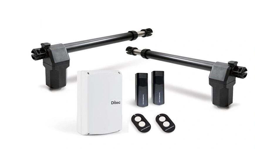 Motorreductor electromecánico irreversible con brazo telescópico, baja tensión, con encoder interno integrado, para portones batientes con hoja máxima de 4 m.