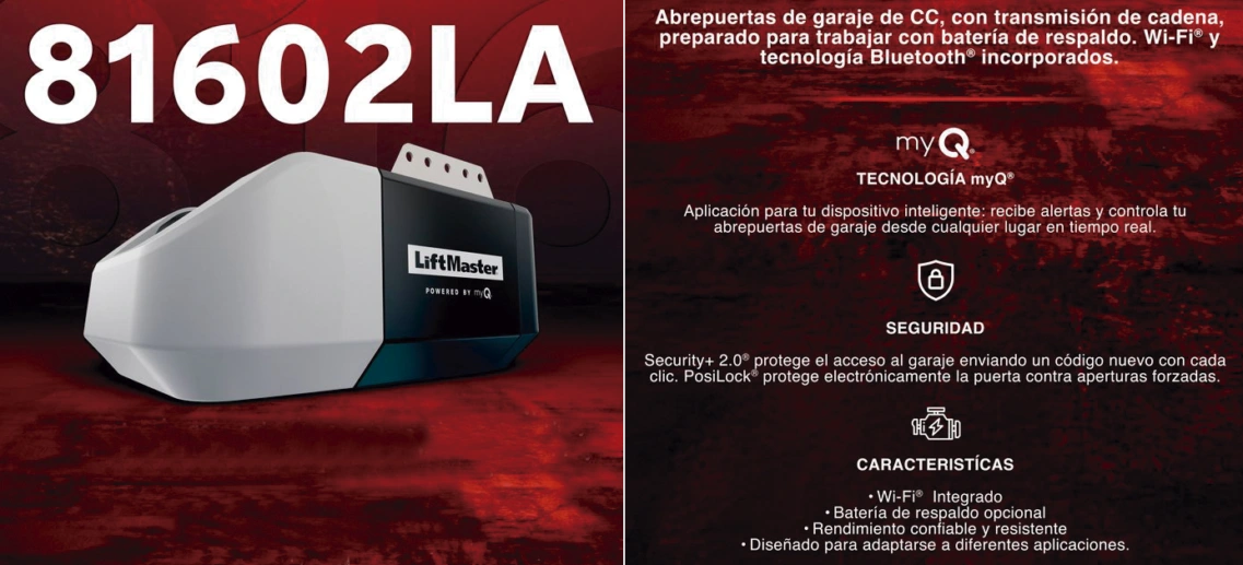 Operador DC para montaje en pared.Activación desde celular mediante app MyQ (incluye WIFI).